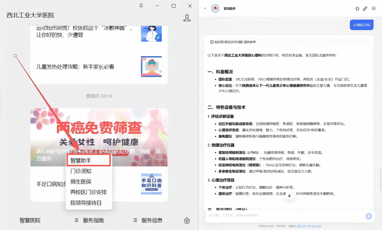 随着AI技术的发展,为了方便师生咨询医院常规业务情况,医院在微信公众号上新了“智慧助手”,可进行门诊信息、坐诊时间、咨询电话、开展业务等情况的智慧咨询,便利师生。