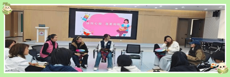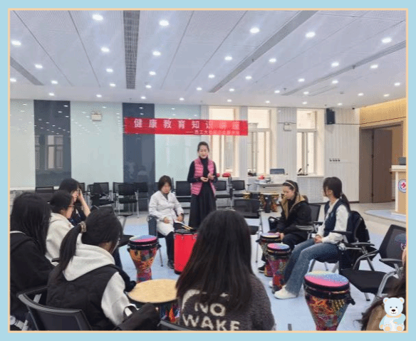 周杨医生首先以通俗易懂的语言讲解了月经周期规律、痛经、经前期综合征等医疗常识,同时也针对一些传统错误观念进行纠正,帮助同学们建立科学的女性健康观念。随后,现场转入“鼓圈疗愈”环节,同学们围坐一圈,在聂佩心理引导师的带领下,在节奏律动中敲击手鼓,同学们缓缓释放着压力、舒缓着内心的情绪。一位同学甚至默默地流下眼泪,不能自己。最后同学们也在音乐的集体互动中感受到彼此的支持、力量、共鸣与理解。