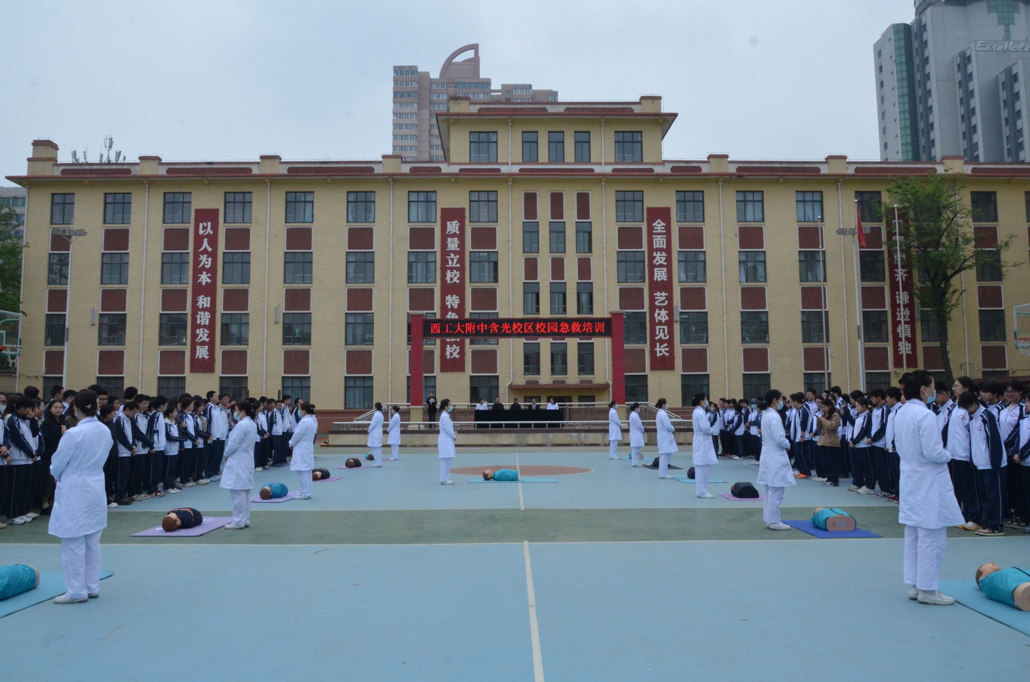 4月9日,应西北工业大学附属中学含光校区邀请,校医院副院长何凯亮、护理部主任兼该校健康副校长张爱凤带领医护团队走进校园,面向高一、高二全体学生,部分任课教师、行政人员、后勤安保及食堂工作人员开展了一场急救技能专题培训。培训会由该校政教处主任赵宁主持,书记周昕涛、执行校长张汉升出席活动。
