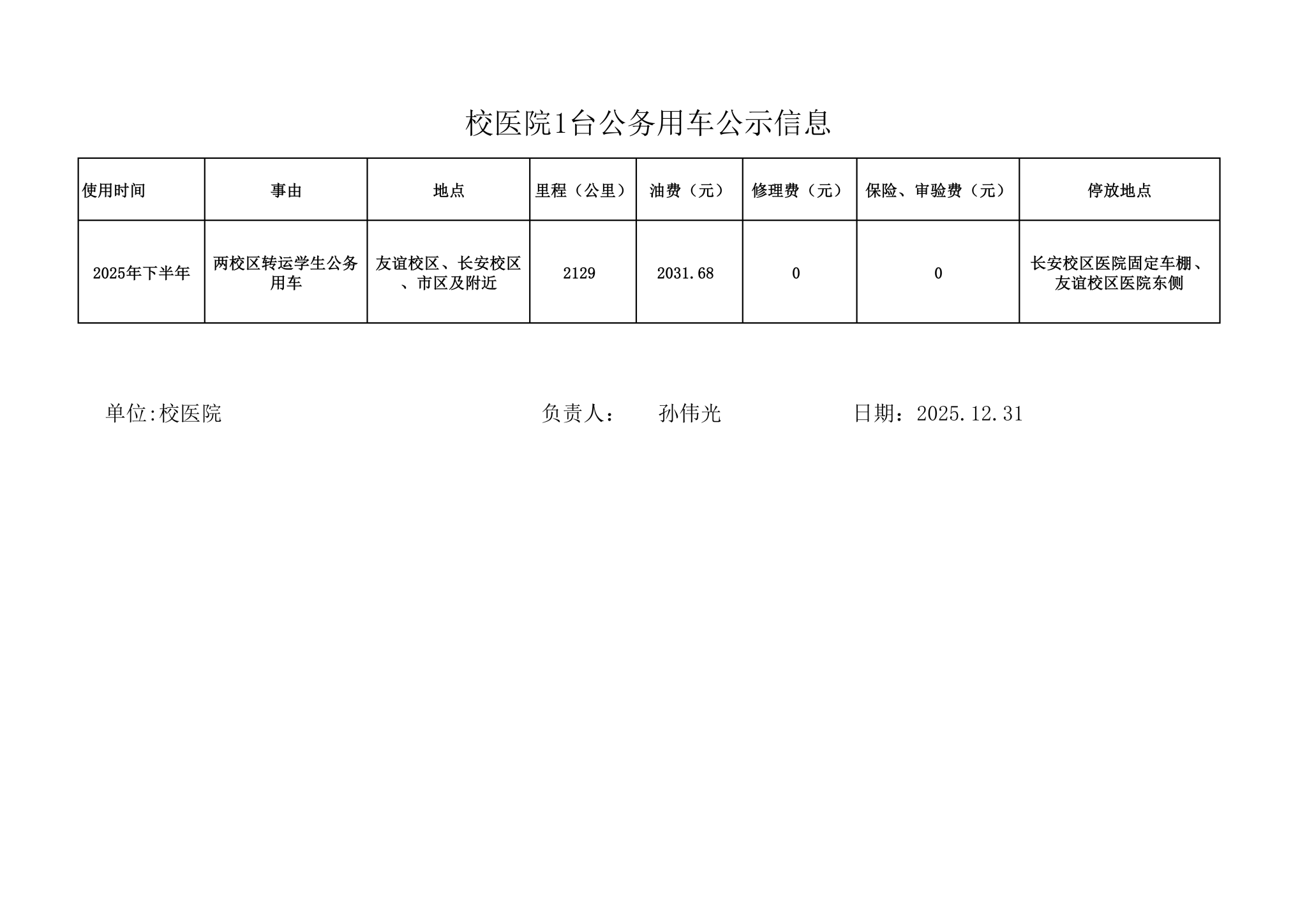 校医院1台公务用车公示信息