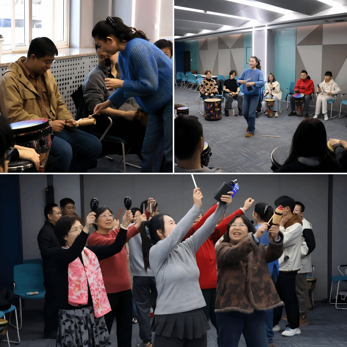 “不用纠结乐理,你喜欢的节奏就是最好的!”在聂佩老师的引导下,全场师生开启即兴演奏模式。高低音鼓点此起彼伏,沙槌与金属乐器的清脆声响交织,没有对错之分,只有随心而发的律动。随后,几位师生志愿者大胆展示专属节奏,独特的敲击方式赢得阵阵喝彩,每个人都在节奏中找到了属于自己的情绪出口。